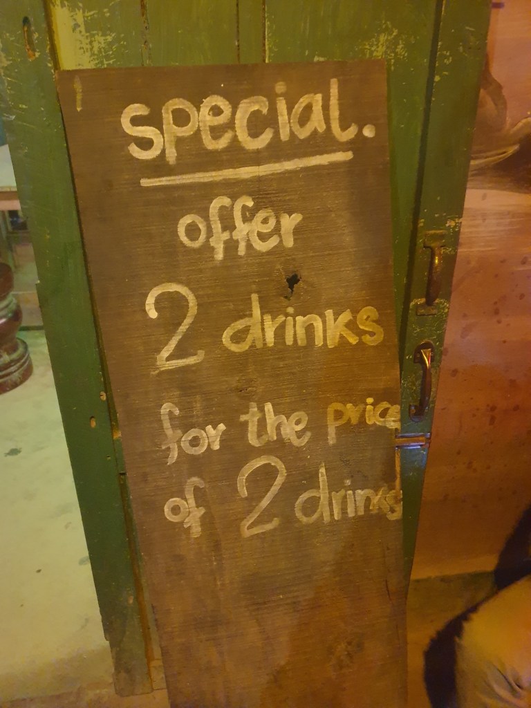 Nothing fancy, but it had clean sheets, air con & a double bed. Sorted! Had a surprisingly lively night in the town including a curry with some of others at the guesthouse, and a bar where some Brits had hijacked the sound system with UK club classics 😛 a night kept pretty sober with these kinds of drinks offers floating about: