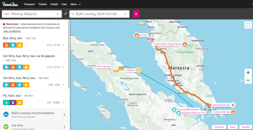 I’d looked into different options via RometoRio and thought I’d struck lucky with a ferry service between Penang and Sumatra. If you haven’t heard of ‘RometoRio’ before, it’s a brilliant little app and website for travellers… similar to Google maps, input point A and B and it’ll spit out a host of different routes and travel options for the journey including; journey times, a visual guide of the choice of routes, and pricing information (always double check this though). It’s much much better than Google though at combining different travel methods to get you the best route.
