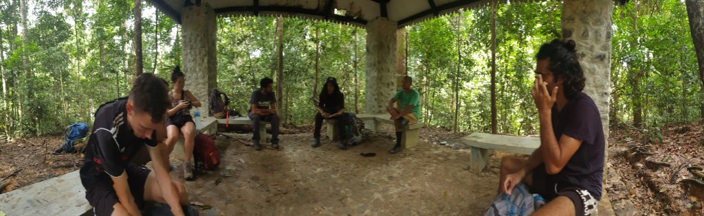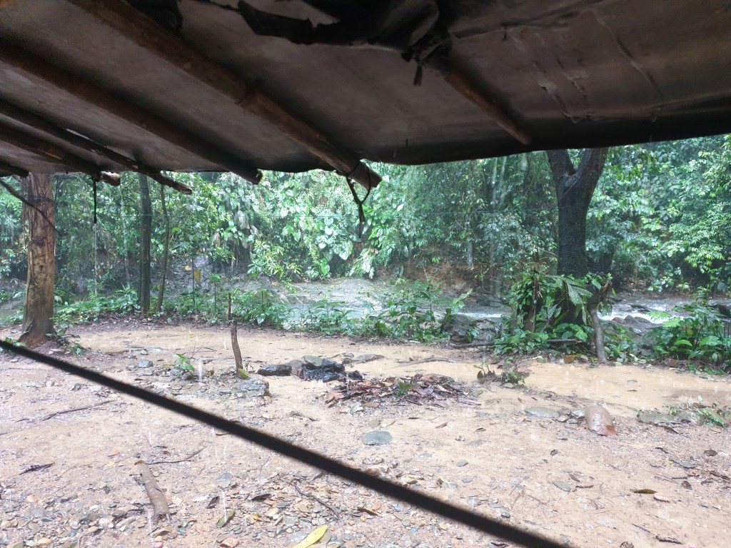 Thankful to get some cover from the rain, we rested a while after a day spent trekking up and down peaks and navigating the tree roots that seem intent on catching you somewhere on your face and/or legs.