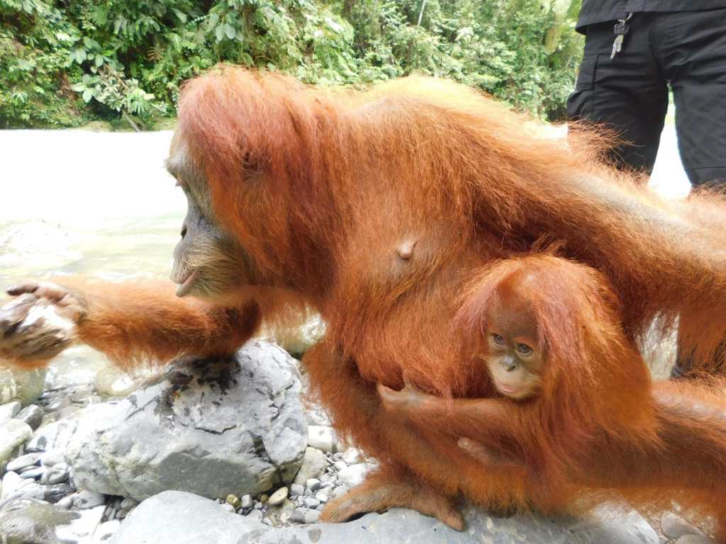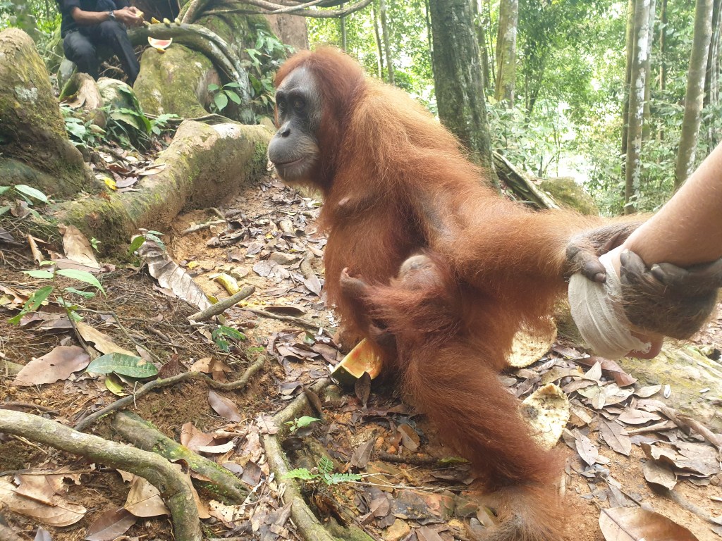 I sat down close to Jackie, and she grasped my hand tight, as her child hung onto her below. Jackie, like Nina, is another rescued orangutan that’s grown up in the safety of the sanctuary, and is now living a free life out in the wild.